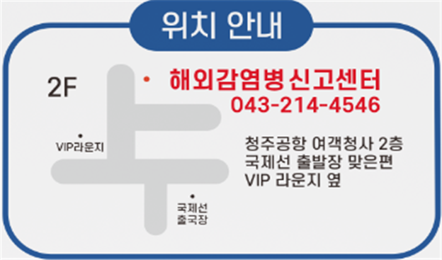국립평택검역소 (검역소) 평택시 포승읍 평택항만길73 평택항마린센터 2층 국립평택검역소 검역과 안내 약도 안내 사진 (출국장) 청주국제공항 국제여객터미널 출국장(2층) 부근 안내 약도 안내 사진