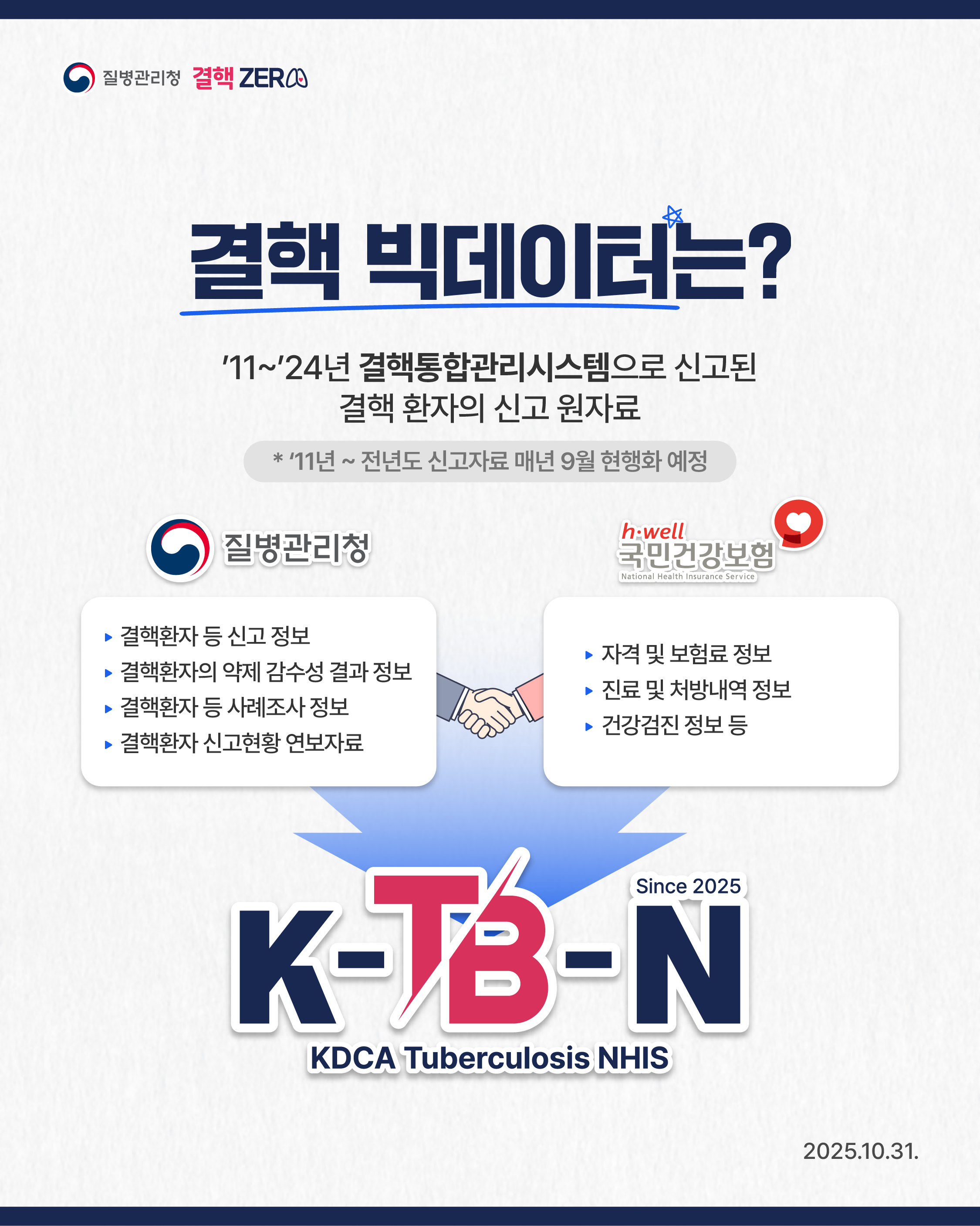 결핵 신고자료와 국민건강보험공단의 건강정보를 연계한 ‘결핵 빅데이터(K-TB-N)’을 개방했습니다.