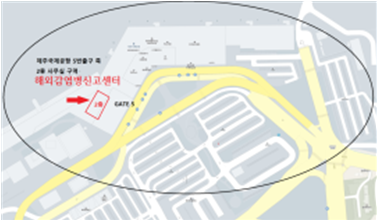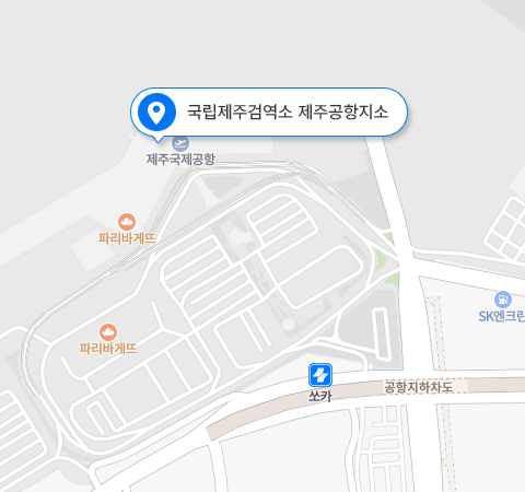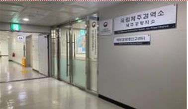 국립제주검역소 (검역소) 제주국제공항 5번 게이트 쪽 2층 국립제주검역소 제주공항지소 사무실 내 (에스컬레이터, 화장실 옆) 안내 약도 안내 사진 (입국장) 제주공항 입국장 검역대 옆 안내 약도 안내 사진