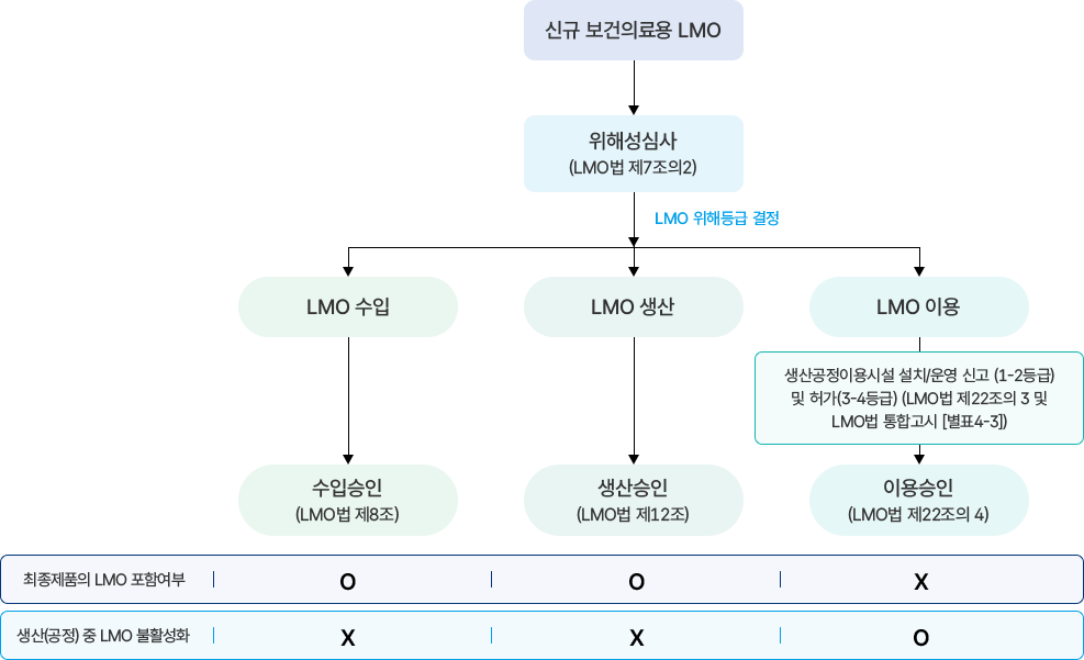 - 보건의료용 LMO의 수입, 생산, 이용 승인 신청 전에 질병관리청의 위해성심사를 받아야 함