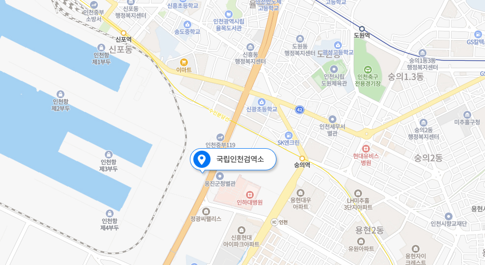 - 하인천 및 동인천에서 삼익아파트 → 인천출입국ㆍ외국인청 → 국립인천검역소 정문으로 진입