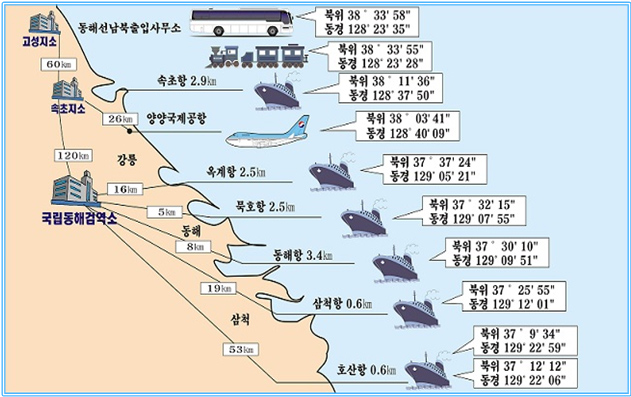 | 동해선남북 출입사무소 | 강원도 고성군 현내면 동해대로 9109(북위 38도33분58초, 동경 128도23분35초) |