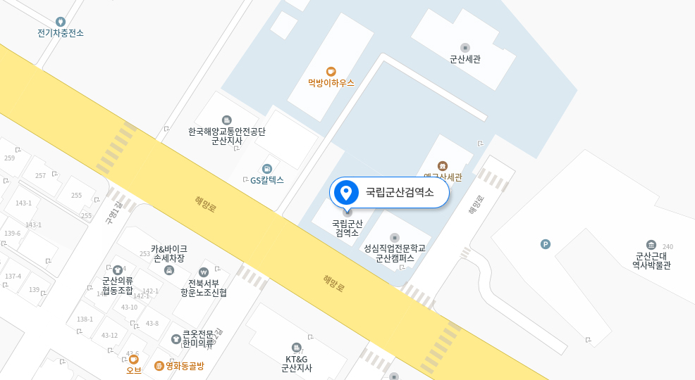 주소 및 연락처 군산검역소 주소 : 전라북도 군산시 해망로 250번지 (우) 573-030 전화 : 063)445 - 4239, 445 - 7494 / FAX 063)446 - 1358 약도 군산검역소 교통안내 군산검역소 자가용 이용 군산 IC 및 전주 방향에서 군산경찰서 지나 군산항 방향으로 우회전하여 근대역사박물관 지나 30m 전방 우측에 위치 대중교통 이용 근대역사박물관에서 하차 도보 150m 전방 우측에 위치 버스번호 : 1번, 2번, 4번, 5번, 6번, 8번, 16번, 17번, 88번, 89번