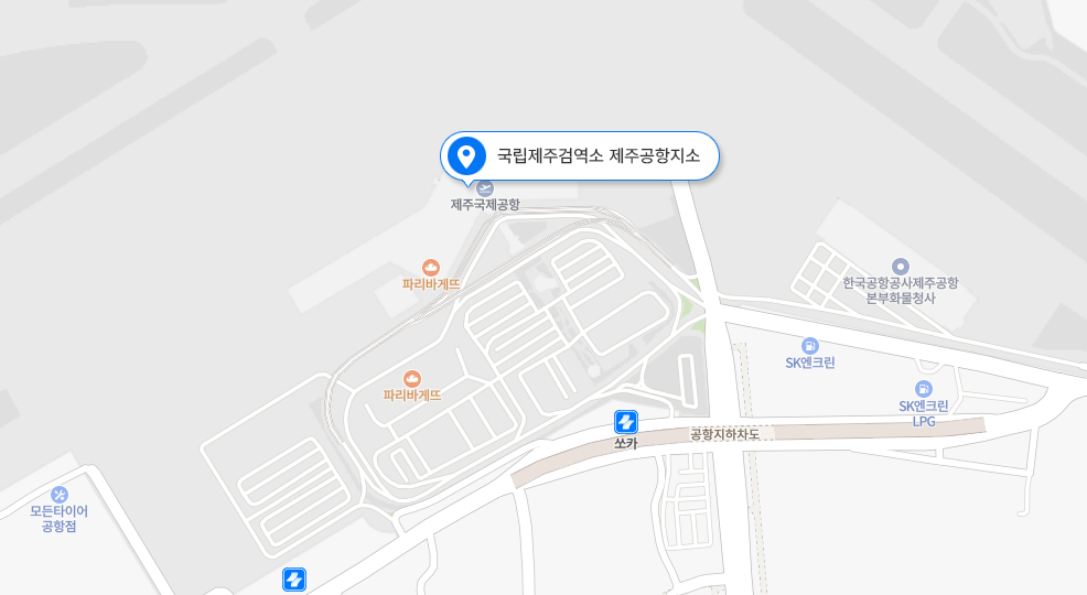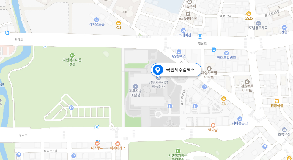 주소 및 연락처 국립제주검역소 본소 주소 : 제주특별자치도 제주시 청사로 59 (도남동) 정부제주지방합동청사 3층 356호 (우 63219) 전화 : 064-728-5500 (FAX 064-728-5503) 제주공항지소 주소 : 제주특별자치도 제주시 공항로 2 (용담2동) (우 63115) 전화 : 064-746-7530,7539 (FAX 064-746-7534) 약도 국립제주검역소 본소 제주공항지소