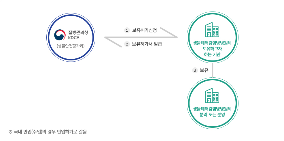 - 감염병의 진단 및 학술연구 등을 목적으로 생물테러감염병을 일으키는 병원체 중 보건복지부령으로 정하는 병원체(이하 “생물테러감염병병원체”라 한다)를 보유하고자 하는 자는 사전에 질병관리청장의 허가를 받아야 한다. 다만, 감염병의사환자로부터 생물테러감염병병원체를 분리한 후 보유하는 경우 등 대통령령으로 정하는 부득이한 사정으로 사전에 허가를 받을 수 없는 경우에는 보유 즉시 허가를 받아야 한다.